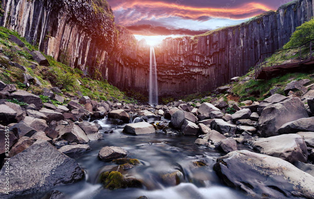 Amazing landscape. Scenic image of Iceland nature. Skaftafell Waterfall with colorful sky during sunset, Vatnajokull National Park, Iceland, Europe. Long exposure shot. Creative image. retro style