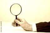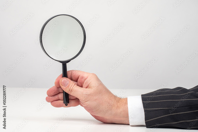 Hand of a man with a magnifying glass close-up. Magnifying glass