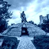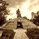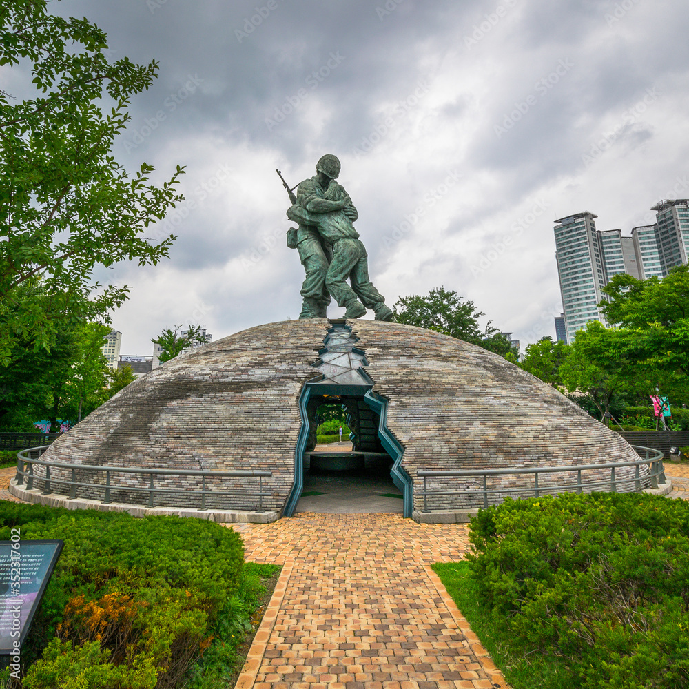 Seoul, South Korea - July 10 2018: Monument of the Korean war veterans outside of the War Memorial of Korea (전쟁기념관).