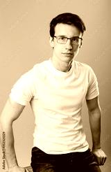 Young man in everyday monotonous clothes sits on a white background and confidently looks straight into the camera with a serious expression on his face.