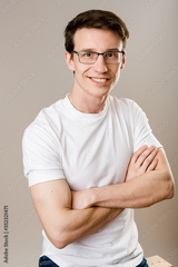 Young, confident production worker wearing glasses and a shirt sits on a grey background with his hands crossed on his chest and a nice, trusting smile looking at the camera.