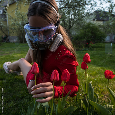 Young beautiful girl portrait in a mask with degree of protection 3M posing in twilight of spring garden.