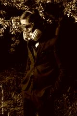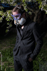 Young man portrait in mask with degree of protection 3M posing in twilight of spring garden.