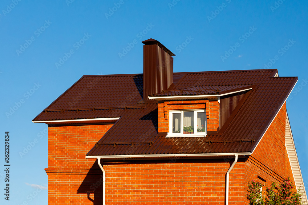 Roof of a brick house or cottage made of brown metal tiles with a Bay window, gutters, tides and a chimney against the blue sky. Metal roof for roof design, construction, architecture.
