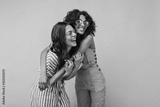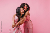 Amazing, beautiful lady rejoice and enjoy photo shoot in pink. African girls with curly hair in sunglasses laugh