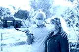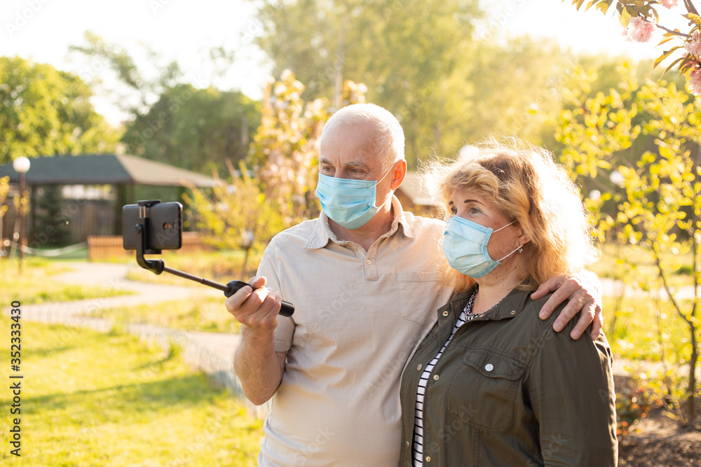 Senior couple making selfie and embracing in spring or summer park wearing medical mask to protect from coronavirus