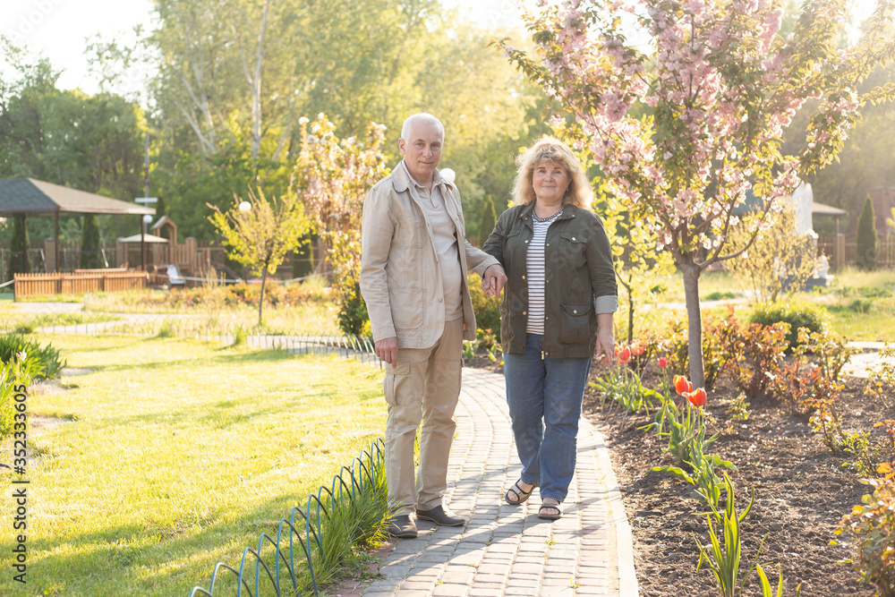 Old man and old woman as a couple in the summer in the sun, senior couple relax in spring summer time. Healthcare lifestyle elderly retirement love couple together valentines day concept