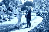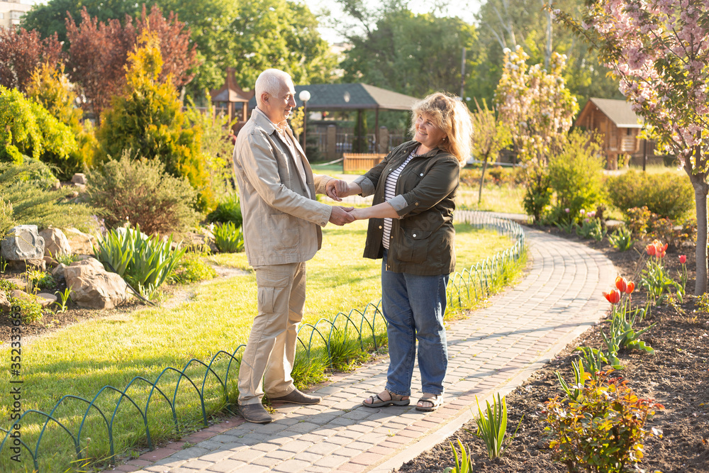 Happy old elderly caucasian couple smiling in park on sunny day, senior couple relax in spring summer time. Healthcare lifestyle elderly retirement love couple together valentines day concept