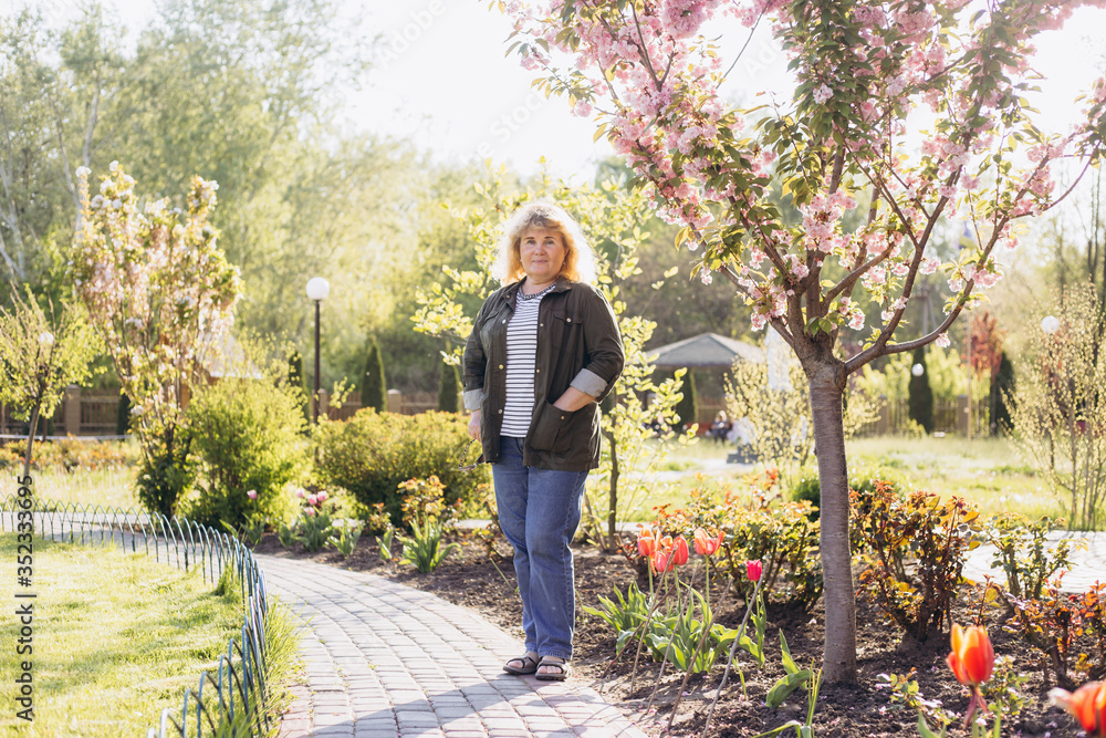 happy older woman standing outside in summer