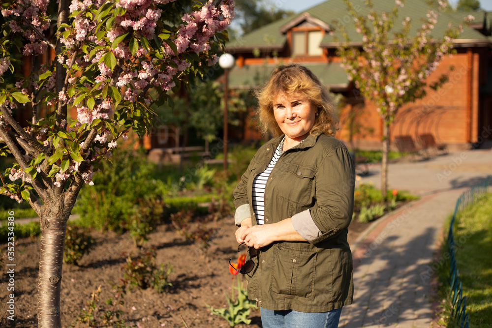 Senior woman walking in green park, happy retirement