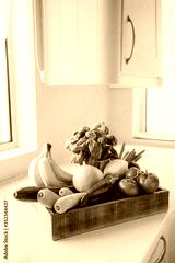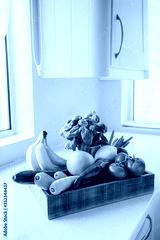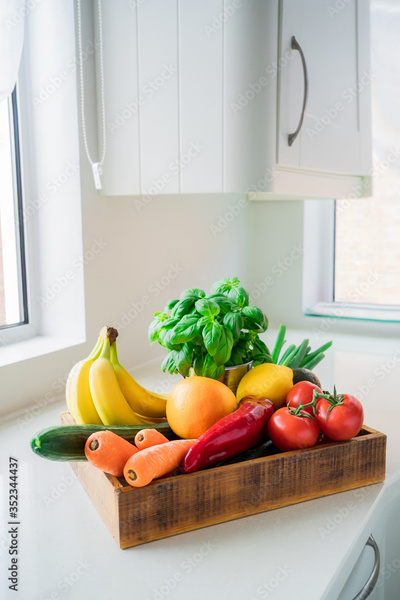 Fresh organic vegetables, fruits and greenery in a wooden crate on white kitchen table. Local farmer healthy food. Zero-waste and plastic-free lifestyle. Delivery concept. Vertical card. Copy space