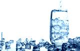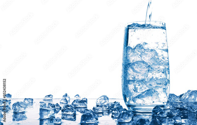Pouring water into glass with ice isolated on white background