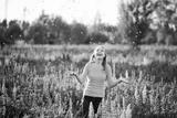 A happy woman in a yellow sweater jumps and enjoys life in a field of blooming purple lupines at sunset. The girl throws up the petals.