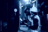 A engineer under checking the industry cooling tower air conditioner is water cooling tower air chiller HVAC of large industrial building to control air system.