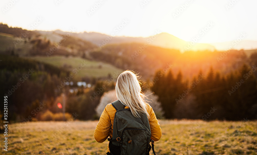 Rear view of senior woman walking outdoors in nature at sunset, hiking.