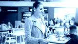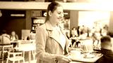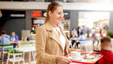Portrait of happy smiling young woman walking in cafe with breakfast on plastic tray