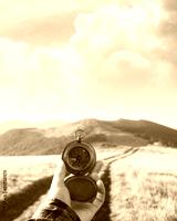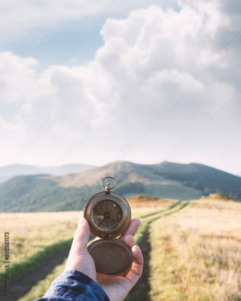 Man with compass in hand on mountains road. Travel concept. Landscape photography
