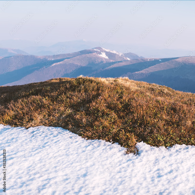 Snowy hills with orange grass and clear sky in spring mountains. Landscape photography