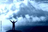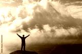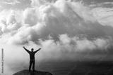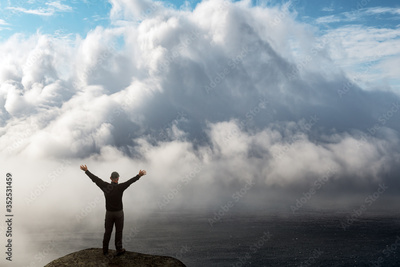 Silhouette of a man with arms raised standing on the edge of a cliff above a foggy ocean. Travel concept. Landscape photography