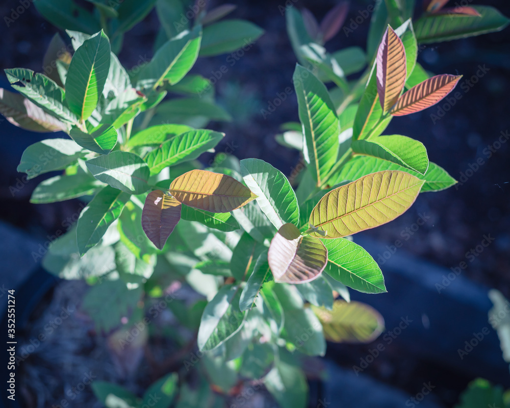 Young red-purple guava leaves on small plant growing in pot at homegrown garden near Dallas, Texas, USA