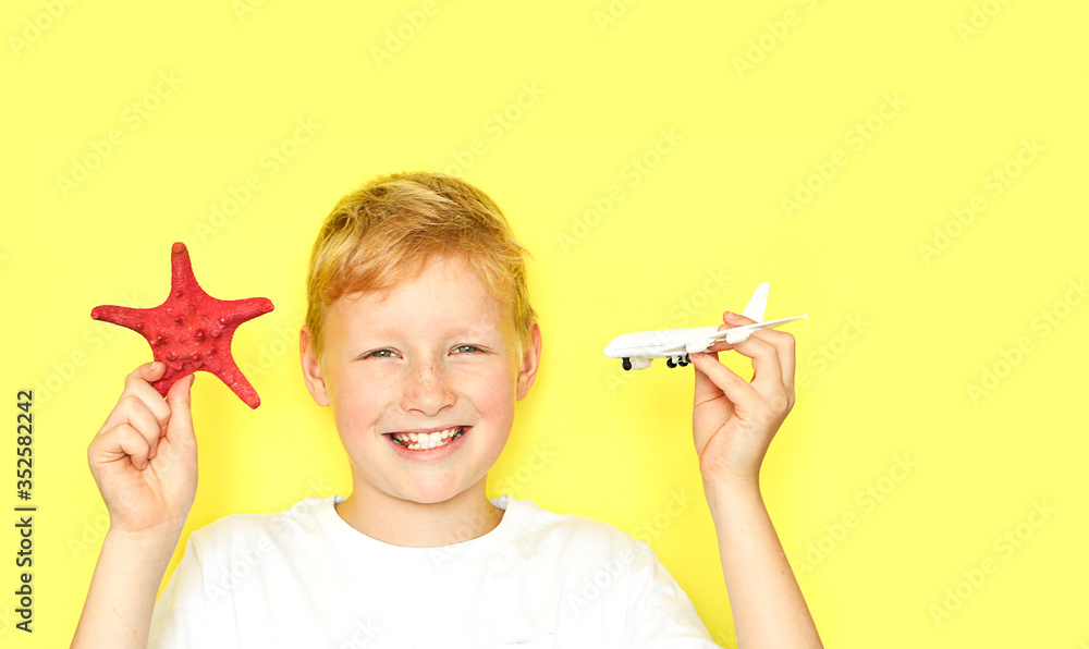 Summer vacation concept, travel.Happy smiling 9 year old Caucasian boy i holds a starfish and toy plane in his hands on a yellow background. Kid having fun on summer vacation. Copy space