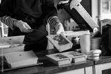 Restaurant worker wearing protective mask and gloves packing food boxed take away. Food delivery services and Online contactless food shopping.