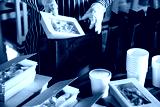 Restaurant worker wearing protective mask and gloves packing food boxed take away. Food delivery services and Online contactless food shopping.