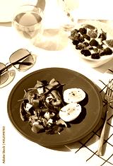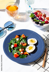 Healthy sunny morning breakfast on the white table. A Smoothie bowl and A Salad with spinach, red pepper, feta cheese eggs with boiled eggs.