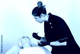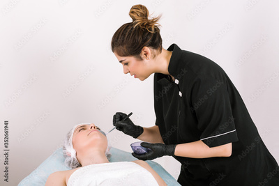 Girl cosmetologist isolated from white background in medical clothes and protective disposable hygienic gloves with a brush puts treatment substance on face of female patient lying on table.