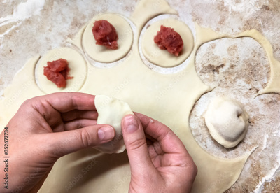 Dumplings raw and dough, traditional making of Russian pelmeni. Process of cooking ravioli, tortellini and pierogi with meat.