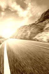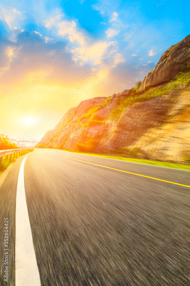 Motion blurred mountain road,asphalt roads and mountains with sky clouds at sunset.