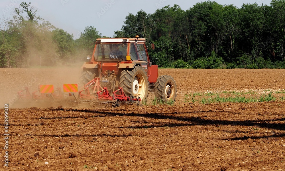 Tractor plows the field, raising clouds of dust, in preparation for spring sowing.