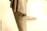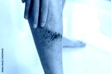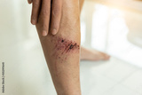 Red Wound injury on man leg with scabs, abrasion. Wound happen during young man playing sport, fall down on the floor. He get injured at shin. It is big wound. He get painful, touch wound copy space
