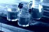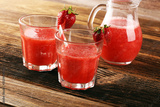 Glass of Sweet fresh strawberry juice and fresh strawberries on table. Healthy food and drink concept