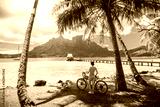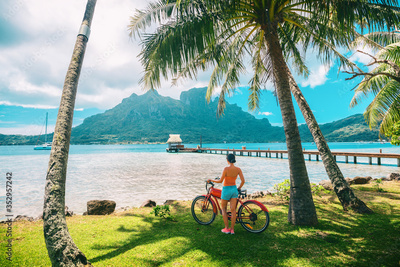 Tahiti travel biking tourist on electric bicycle rental in Bora Bora island , French Polynesia eco-tourism summer vacation adventure fun cyclist girl relaxing at landscape on E-bike biking.