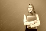 Portrait of beautiful woman with hijab is holding computer laptop on gray background