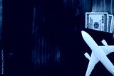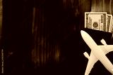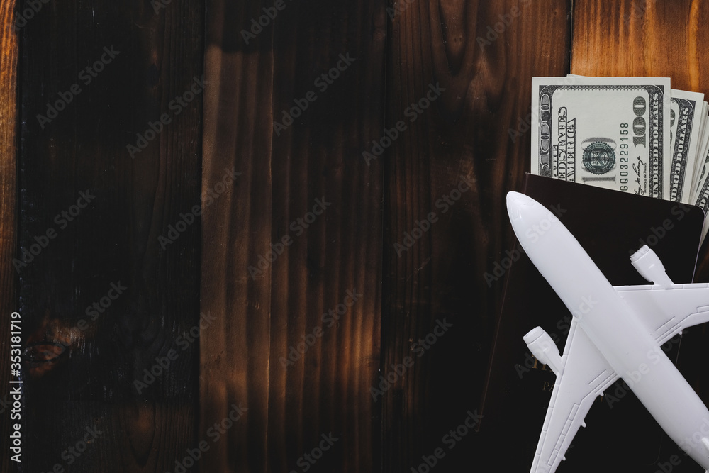 White model of passenger plane with passport and money on old wooden background. Travel saving and planning concept - Top view.