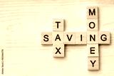 The words "TAX, SAVING, MONEY" made with wooden letters isolated on old wood background.