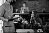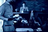 Displeased customer arguing with waiter about food he served to her in a pub.