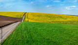 Color lines of arable land and rapeflowerfield and green wheat landscape panoramic