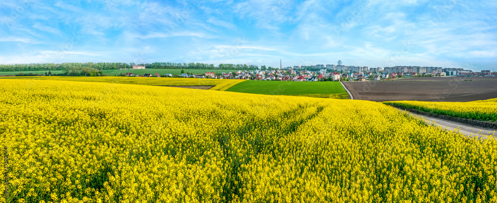 Wonderful panoramic view on the rapeseed field waves from above, and the city on the horizon