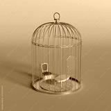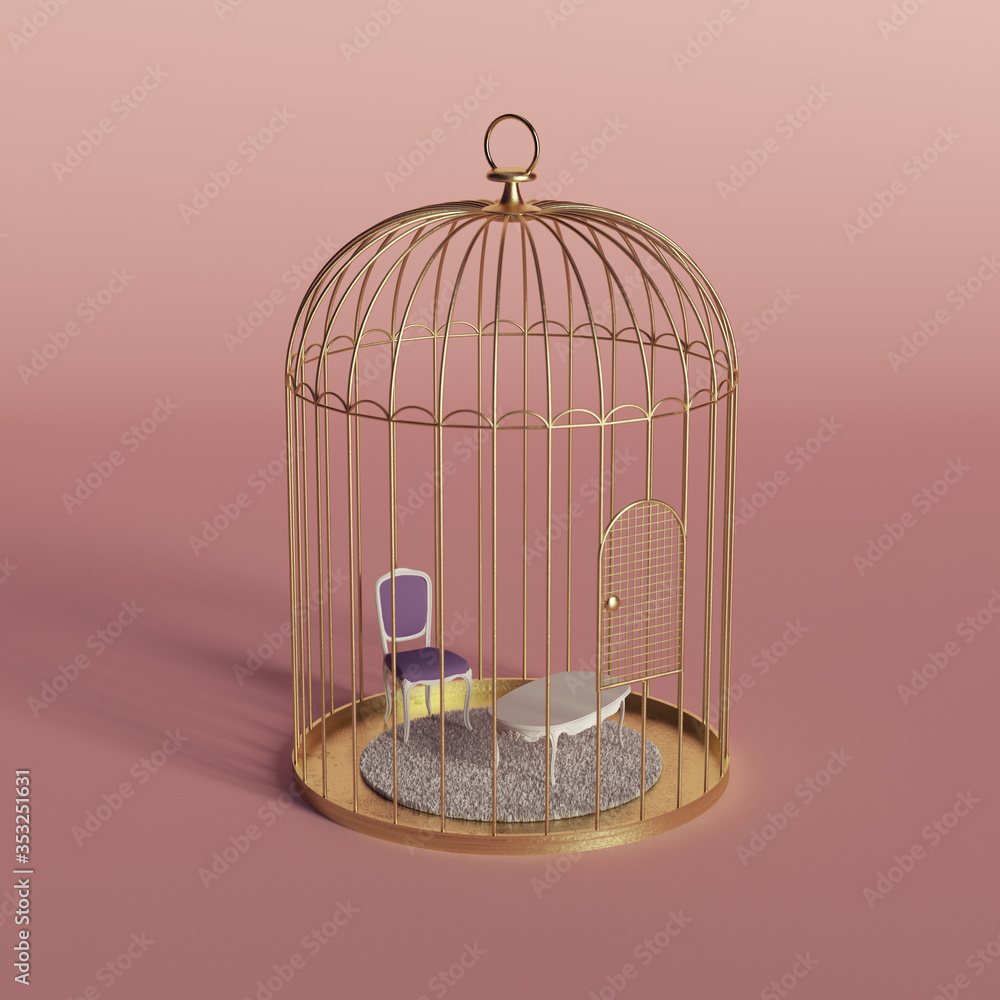 Creative minimal concept with golden bird cage and home furniture. Stay at home idea. Coronavirus or Covid-19 background. 3D Render.