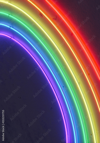 Creative fluorescent color rainbow layout made of neon tubes. Flat lay neon colors. Summer concept. Wall texture dark minimal background.