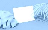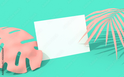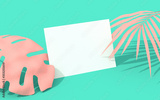Exotic plants with blue backdrop. Tropical layout mockup. Background with painted palm and monstera leaves. Minimal concept art. 3D Render.