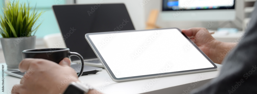 Close up view of male entrepreneur looking information on blank screen tablet and drinking coffee