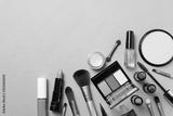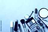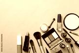 Different makeup cosmetics on brown background. Female accessories