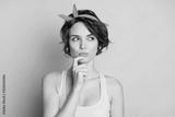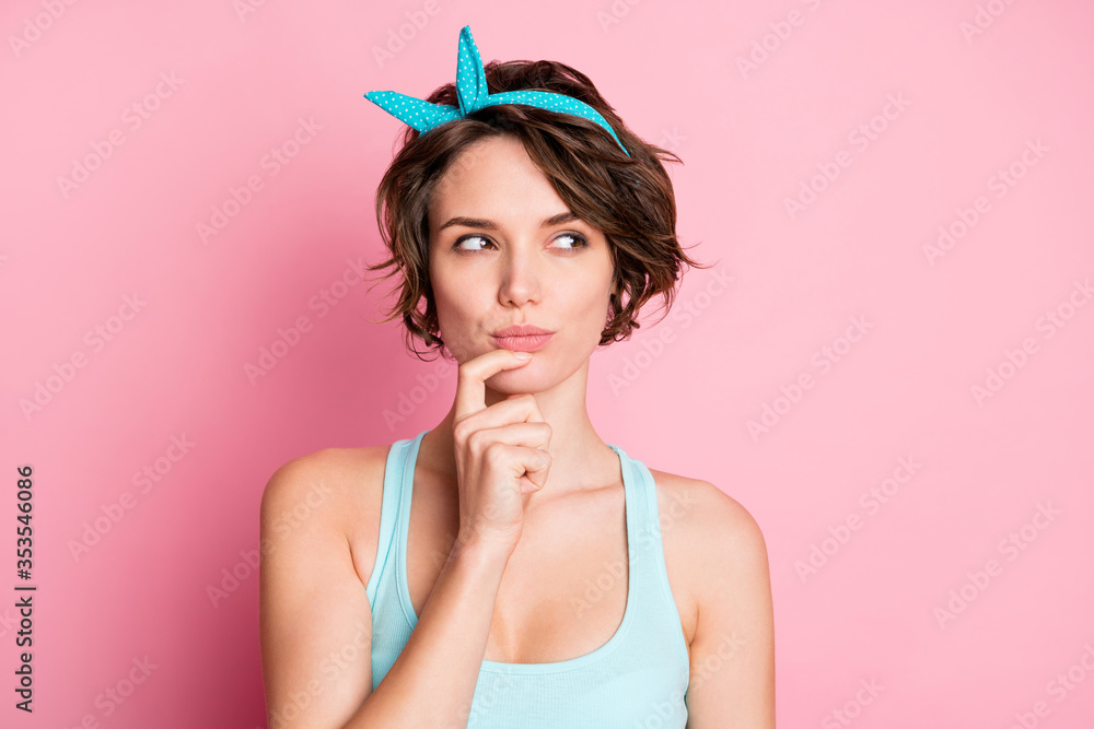 Close-up portrait of her she nice attractive lovely pretty cute charming cunning sly foxy curious girl looking aside thinking creating solution isolated over pink pastel color background