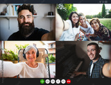 Videocall headshot from webcam of smartphone tablet and laptop of group friends in lockdown from coronavirus, covid-19 - Family multigenerational using videoconference application for meeting