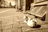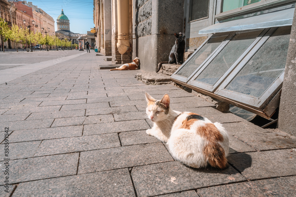 A homeless cat rests in the sun in the center of St. Petersburg against the background of the Kazan Cathedral