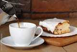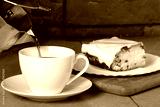 Pouring Coffee into Cup and Cheesecake. Breakfast.